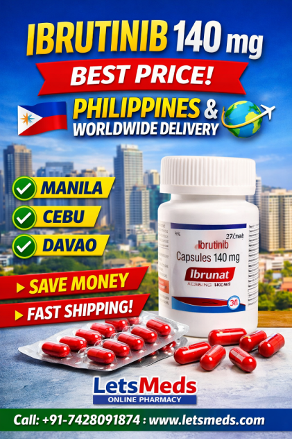 Indian Ibrutinib 140 mg capsules are used to treat several blood cancers, including mantle cell lymphoma, chronic lymphocytic leukemia, and Waldenström’s macroglobulinemia. This medicine works by blocking a specific protein that helps cancer cells grow and survive. If you want to buy Ibrutinib capsules online, you can contact us for availability and pricing. Call +91 7428091874, visit https://www.letsmeds.com, or email letsmeds@gmail.com . We offer fast shipping of Ibrutinib capsules to the Philippines, including Metro Manila, Davao City, Cebu City, and Quezon City, as well as worldwide delivery to countries such as Singapore, UAE, USA, Malaysia, Thailand, and more.