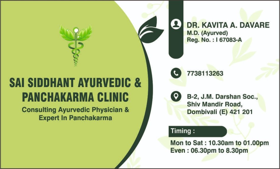 Welcome to Sai Siddhant Ayurvedic & Panchakarma Clinic, Dombivli, led by Dr. Kavita Davare (M.D. Ayurved). Since 2015, the clinic has been providing authentic Ayurvedic care focused on root-cause healing, personalised treatment, and long-term wellness through classical Ayurvedic principles and Panchakarma therapies.