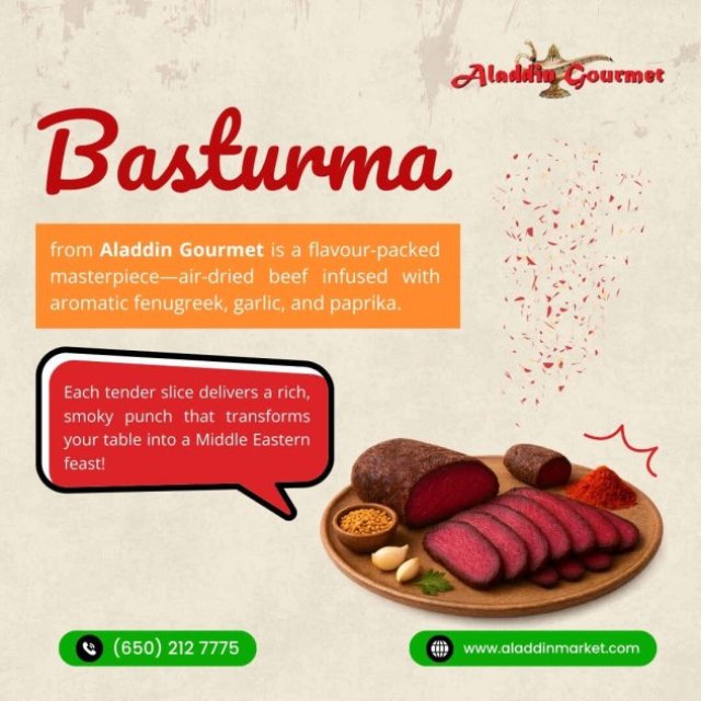 Basturma, also known as pastirma, is a highly seasoned, air-dried cured beef with roots in Armenian, Middle Eastern, and Balkan cuisines. Its history stretches back to ancient nomadic traditions of meat preservation. The beef is coated in a fragrant spice paste called çemen, a blend of fenugreek, garlic, and paprika, and then left to cure, developing an intense aroma and robust flavor.