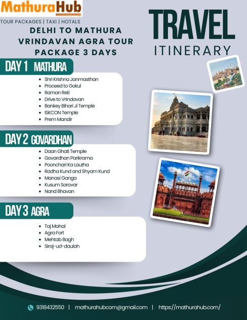 Website Url :- https://mathurahub.com/delhi-mathura-vrindavan-agra-tour-package-3-days/