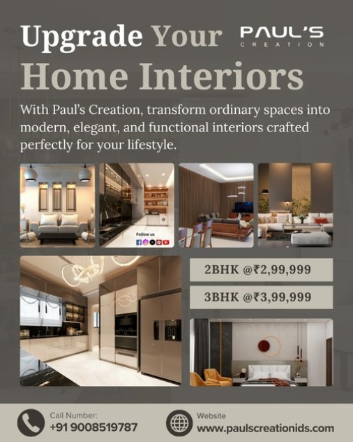 Paul's creation for expert Bangalore Home Interior Designers. Our goal is to design your dream home using creativity, functionality, and elegance. Our team delivers customized solutions tailored to your lifestyle and budget, from modern 2BHK & 3BHK interiors to luxury villa designs.