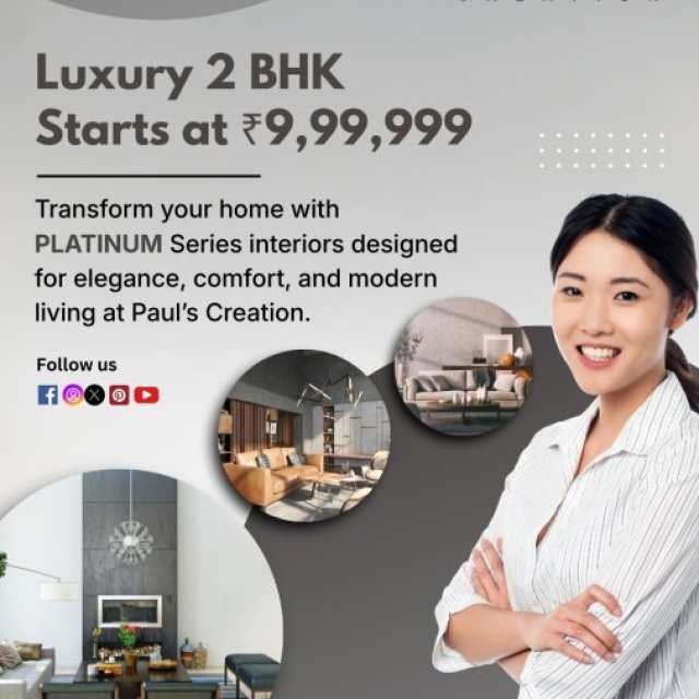 Paul's Creation is recognized among luxury interior designers in Bangalore, delivering elegant and functional interiors customized for modern lifestyles. We specialize in transforming apartments, villas, and luxury homes with innovative designs and premium finishes. Our services include modular kitchens, wardrobes, living rooms, and bedrooms that maximize the use of space. We proudly present luxury 2BHK interiors, crafted for comfort, style, and luxury. Our commitment is to provide quality materials, timely project completion, and cost-effective solutions while focusing on refined design and personalized service. Contact Paul's Creation today for a free consultation.