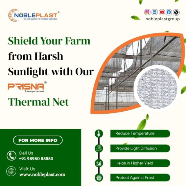5. Protect your farm from extreme sunlight and temperature fluctuations with NoblePlast PRISMA Thermal Net. Designed for modern protected cultivation, this advanced thermal net helps reduce excess heat while ensuring uniform light diffusion across crops. It creates an ideal growing environment that supports healthy plant growth, improves yield quality, and protects crops from frost and harsh climatic conditions. Suitable for greenhouses, polyhouses, nurseries, and open-field farming applications.